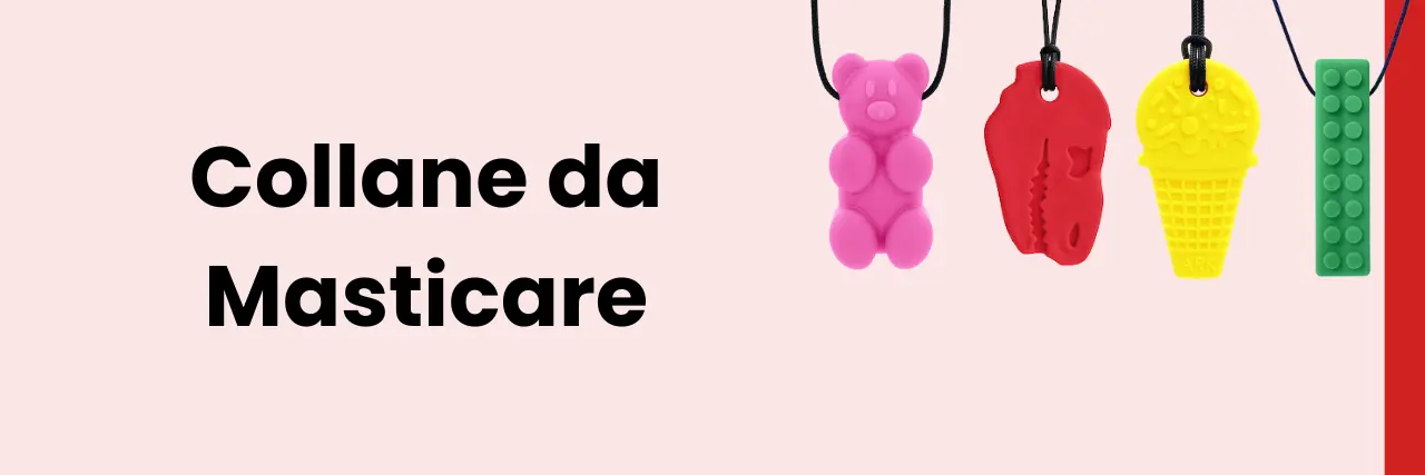 Le collane da masticare sono particolarmente pratiche per le persone che hanno la necessità di avere qualcosa da masticare e vogliono assicurarsi che lo strumento sia sempre con loro! Le collane da masticare sono disponibili con design diversi e accattivanti, in diversi gradi di durezza e colori. Consigliamo le collane da masticare a partire dai 5 anni di età. Il cordino è fissato con una chiusura di sicurezza che si apre quando viene esercitata una forte trazione. Questi strumenti possono essere utili non solo per i soggetti autistici con bisogni sensoriali speciali, ma per differenti tipologie di persone che necessitano di strategie di regolazione. Possono essere utili per scoraggiare l'onicofagia e/o per masticare qualcosa in sicurezza senza bagnare, sporcare o rovinare i vestiti.