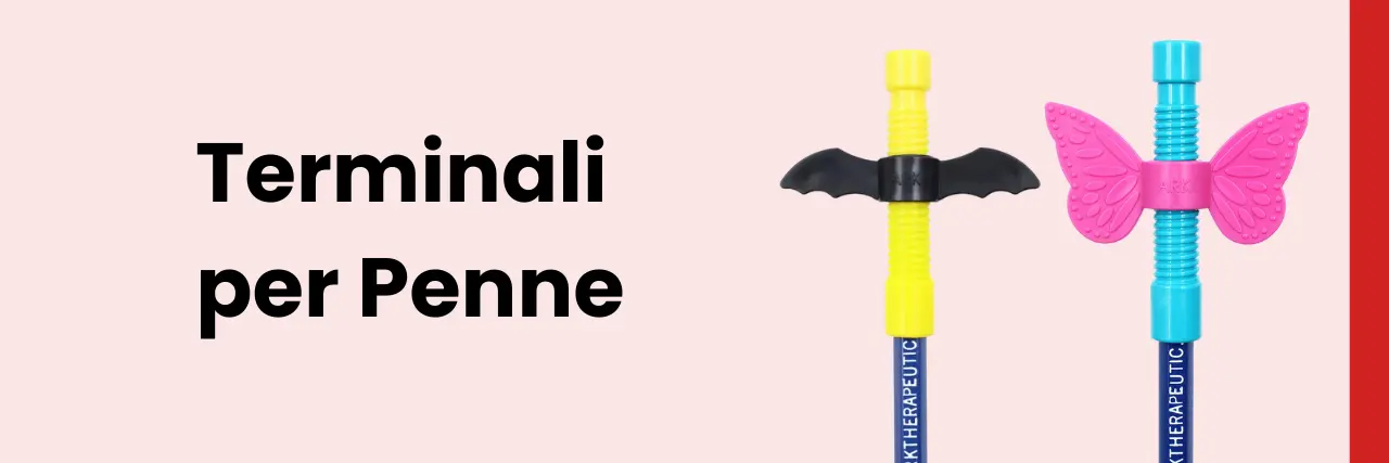 In questa sezione troverai i Terminali per le penne. La masticazione ha un effetto regolatore sul nostro sistema nervoso. Pertanto, a volte rosicchiare le penne è una strategia di regolazione dello stress, del nervosismo o essere una necessità sensoriale che attiva il sistema nervoso parasimpatico. L'estremità della matita può essere dotata di un cappuccio per masticare, in modo che non si stacchino delle schegge di legno. I terminali delle penne proteggono così le matite e la nostra mucosa orale. Questi articoli sono disponibili in diversi colori, forme e gradi di durezza. I Wingamajigs® consentono di giocare con le ali, il che può anche aiutare a concentrarsi su un compito. I terminali delle penne calzano correttamente matite o penne a sfera normali e sottili. Alcuni sono adatti anche a quelle leggermente più spesse. In questo video ti mostriamo perché gli attacchi per la penna sono così ingegnosi!
