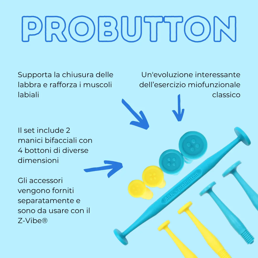 Il Set proButton™ di ARK è uno strumento efficace e sicuro per promuovere la chiusura e la forza delle labbra - basi importanti per un sano sviluppo del viso, del linguaggio e dell'alimentazione. Ispirato ai classici esercizi di motricità orale con fili e bottoni, questo set offre una soluzione più igienica e professionale, senza parti piccole o sottili.