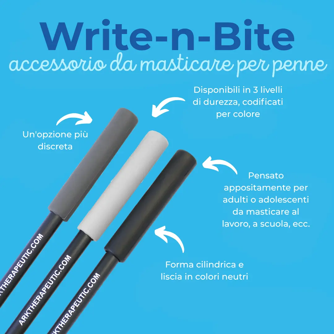 Masticare le penne ti suona familiare? Il Write-n-Bite® di ARK è la soluzione perfetta. Questo terminale per penne liscio e cilindrico ha l'aspetto di un normale tappo di penna, ideale per gli adulti e i bambini più grandi che vogliono masticare senza dare nell'occhio, ad esempio in ufficio o a scuola. Il terminale si adatta a molte penne a sfera comuni (una penna nera è già inclusa) ed è disponibile in tre gradi di durezza.