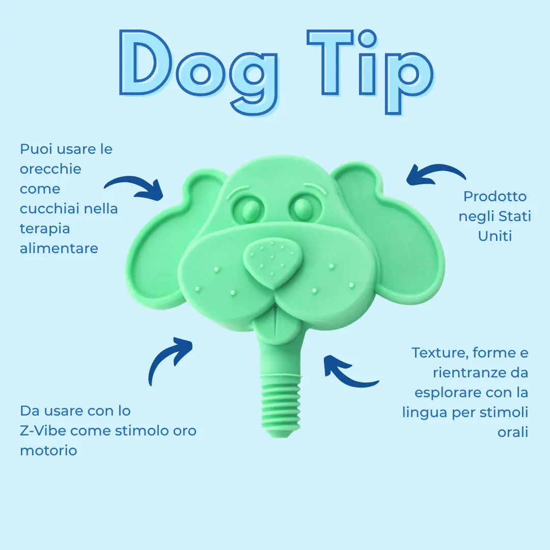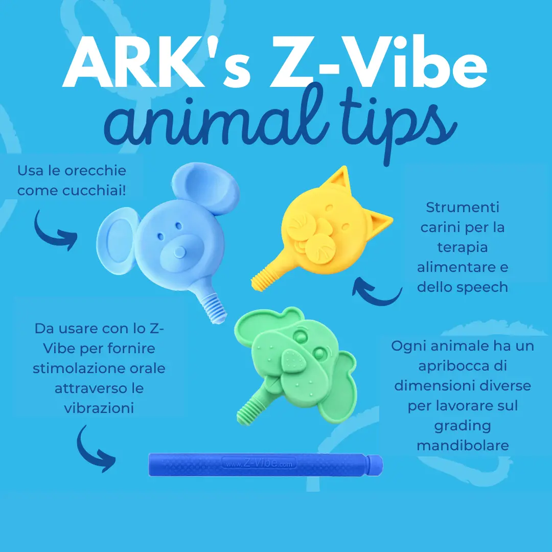 Il set di testine a forma di animali di ARK è uno strumento terapeutico ludico e adatto ai bambini per lo sviluppo orofacciale precoce. I simpatici design a forma di animali (topo, cane, gatto) incoraggiano la curiosità, l'attenzione e la motivazione - ideali per essere utilizzati con lo Z-Vibe®. La stimolazione sensoriale, il rafforzamento della mandibola e la lenta familiarizzazione con le diverse consistenze alimentari sono combinati in modo giocoso.