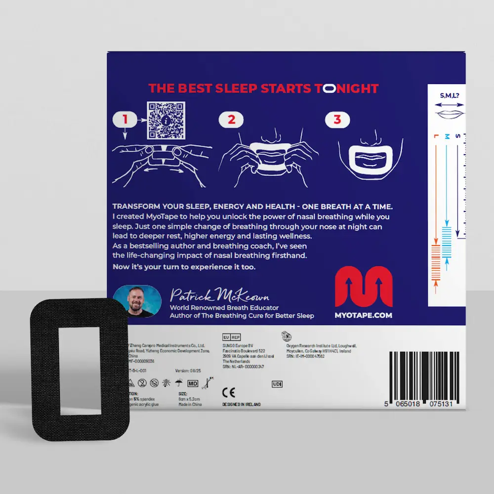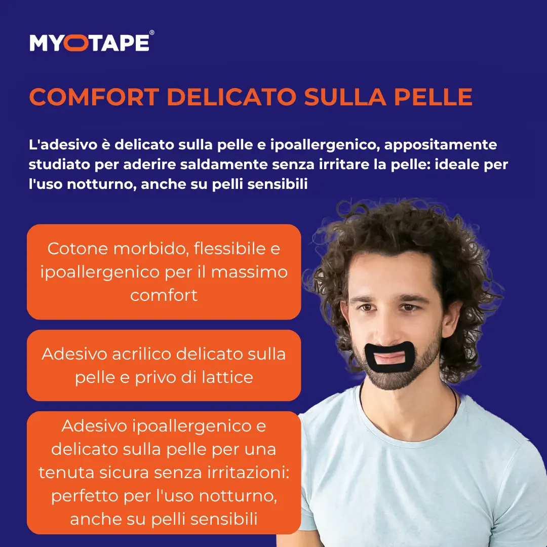 MyoTape favorisce la respirazione nasale durante il sonno, l'attività fisica o la vita quotidiana - senza chiudere completamente la bocca. Il nastro si applica intorno alle labbra e aiuta a mantenere la bocca delicatamente chiusa. Ideale per il russamento, la respirazione con la bocca, la terapia CPAP o la stanchezza legata a una cattiva qualità del sonno.